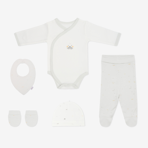 Подходящ за бебета от 0 до 3 месеца и представен в луксозна подаръчна кутия, комплект от 5 части SEALLY ME е стилен и практичен избор за подарък или за първите специални моменти у дома.