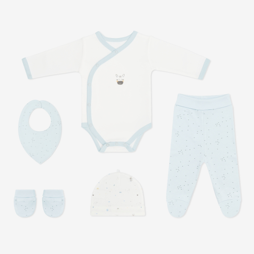 - Пълен комплект – Включва ританки, боди с дълъг ръкав, шапка, ръкавички и лигавник - основните дрешки за новороденото.